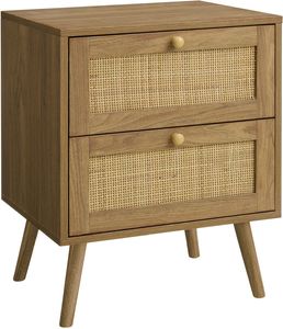 Pratique et moderne, la table d'appoint 24 po au fini laminé noyer comporte deux tiroirs de rangement spacieux avec panneau en rotin naturel et poignées en bois, parfaits pour organiser vos articles essentiels.